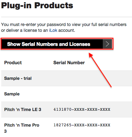 2. Scroll down to the bottom of your products page, under the Plug-in Products category, then click Show Serial Numbers and Licenses, then enter your Serato.com account password, and click 'Submit'.