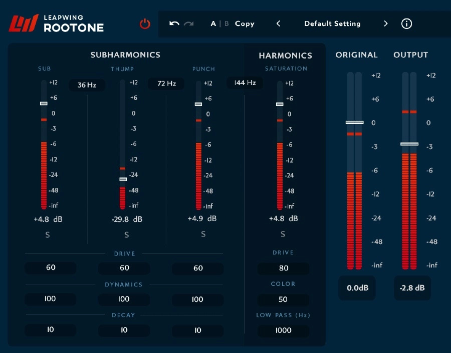 Leapwing RootOne is designed to generate and shape subharmonic frequencies. RootOne comes with 3 low-frequency bands each looking for a frequency an octave above the selected band, and after carefully analysing amplitude and phase, it then generates a clean sound within that band.