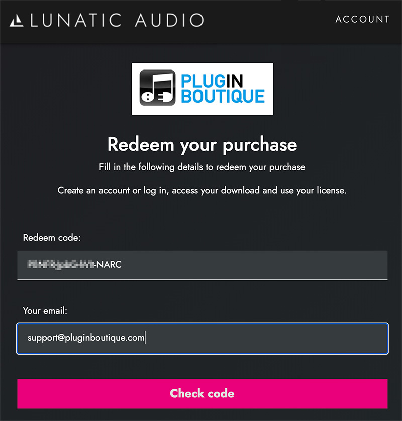 1. Visit https://lunaticaudio.com/plugin-boutique/, enter your Redeem code and Email address > click 'Check code'.