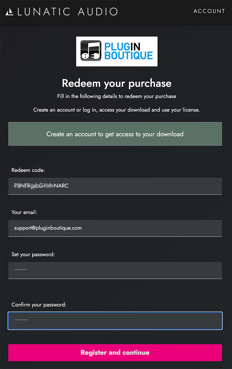 2. Enter a password to create a Lunatic Audio account, or log in using your existing password if you already have an account > click 'Register and continue'.