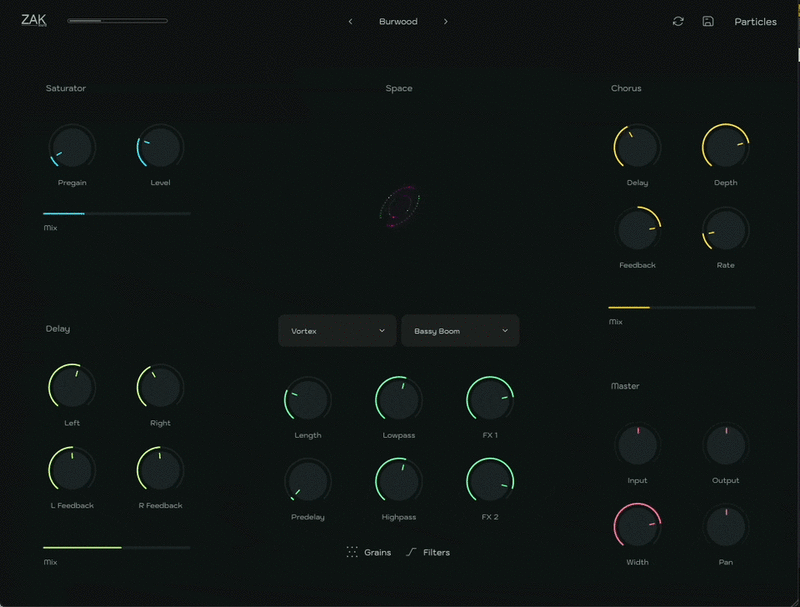 At the heart of Particles lies the Space effect, capable of processing two effects simultaneously from a selection of 37 unique types. Fine-tune your reverb with controls for length, predelay, lowpass, and highpass filters to achieve the perfect fit for your sound.