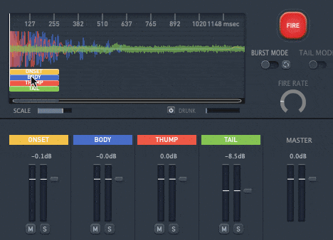 The timing and arrangement of the engines can be precisely offset using the colour-coded built-in timeline. Hit the Fire button to trigger your sounds. Activate Burst mode to create automatic bursts from one-shot assets. Even adjust the fire rate in real-time.