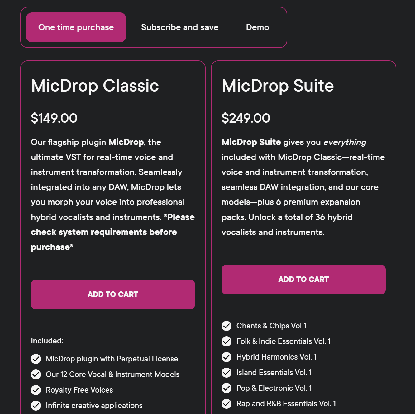 MicDrop Suite gives you everything included with MicDrop Classic, real-time voice and instrument transformation, seamless DAW integration, and our core models - Plus 6 premium expansion packs. Unlock a total of 36 hybrid vocalist and instruments.