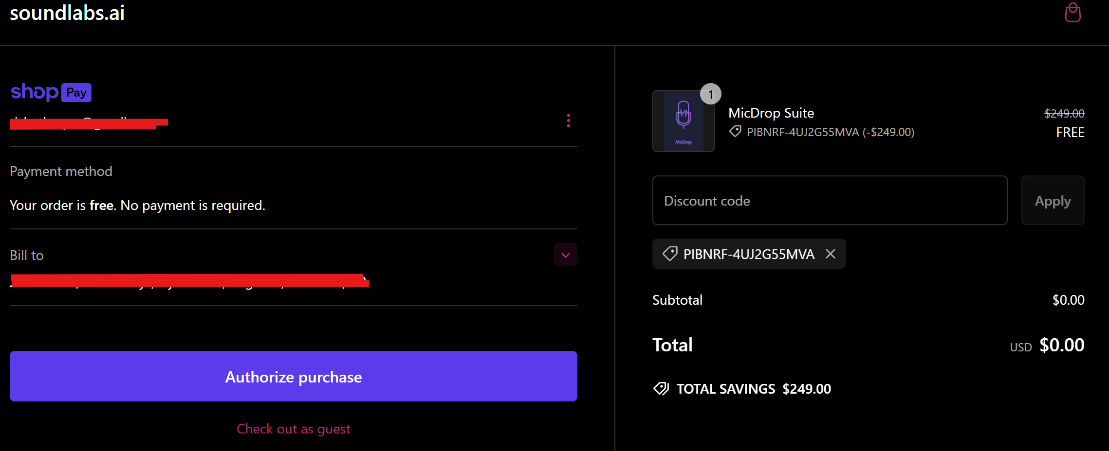 7. Make sure the Total is $0.00 and 'Payment method' reads 'Your order is free. No payment is required' > click Authorize purchase
