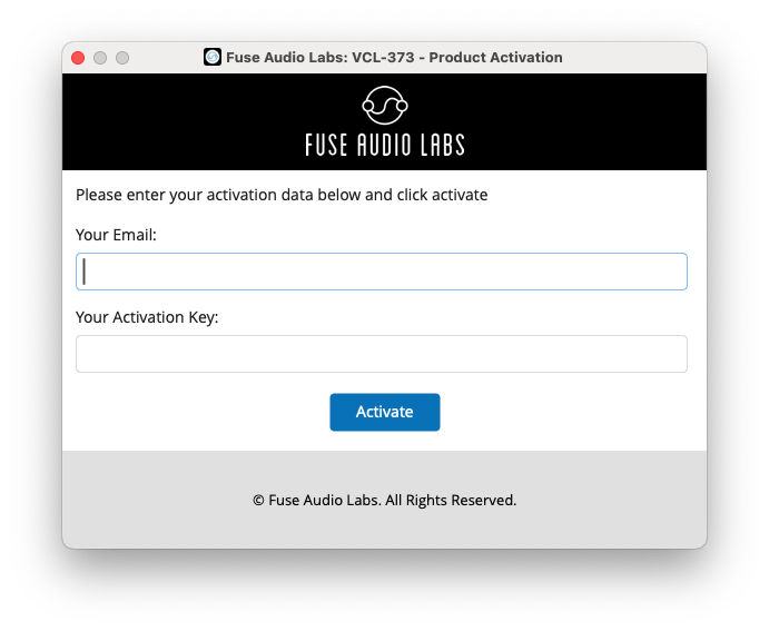 11. Enter your email and the activation key received in your Fuse Audio Labs account earlier > Click 'Activate'.