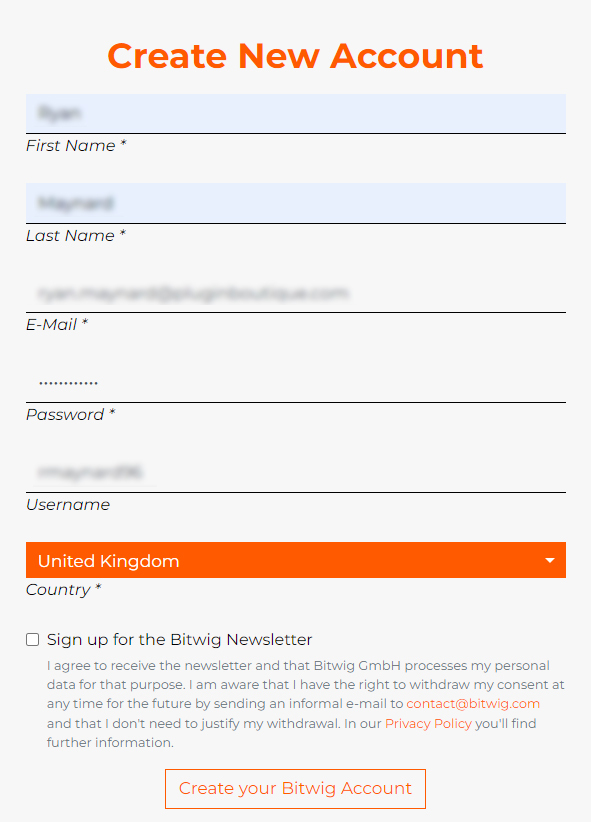1. Click Download in your Plugin Boutique account to go to the Bitwig Registration page > Enter your details > Click Register. If you already have an account log in to your account and skip to step 4.