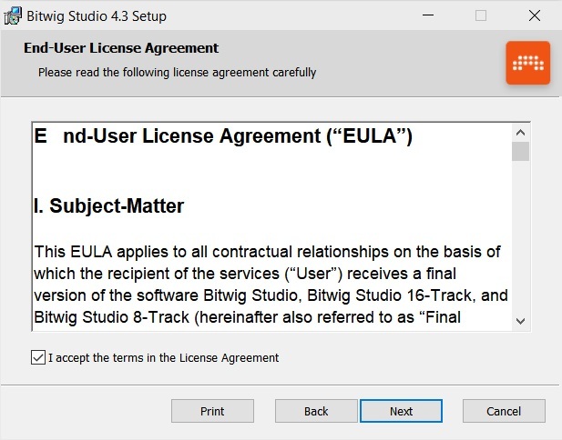 3. Read the End-User License Agreement > Select 'I accept the terms in the License Agreement' > Click Next.