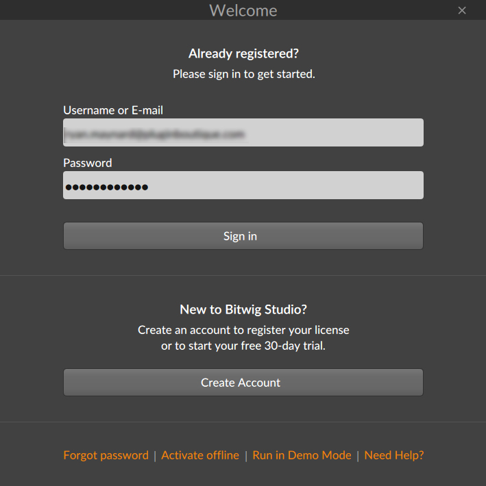 7. Open the Bitwig application > Enter your username/email address and password > Click Sign In.