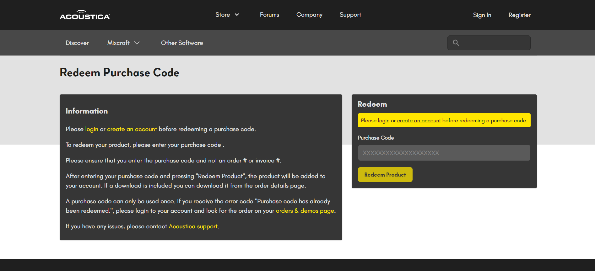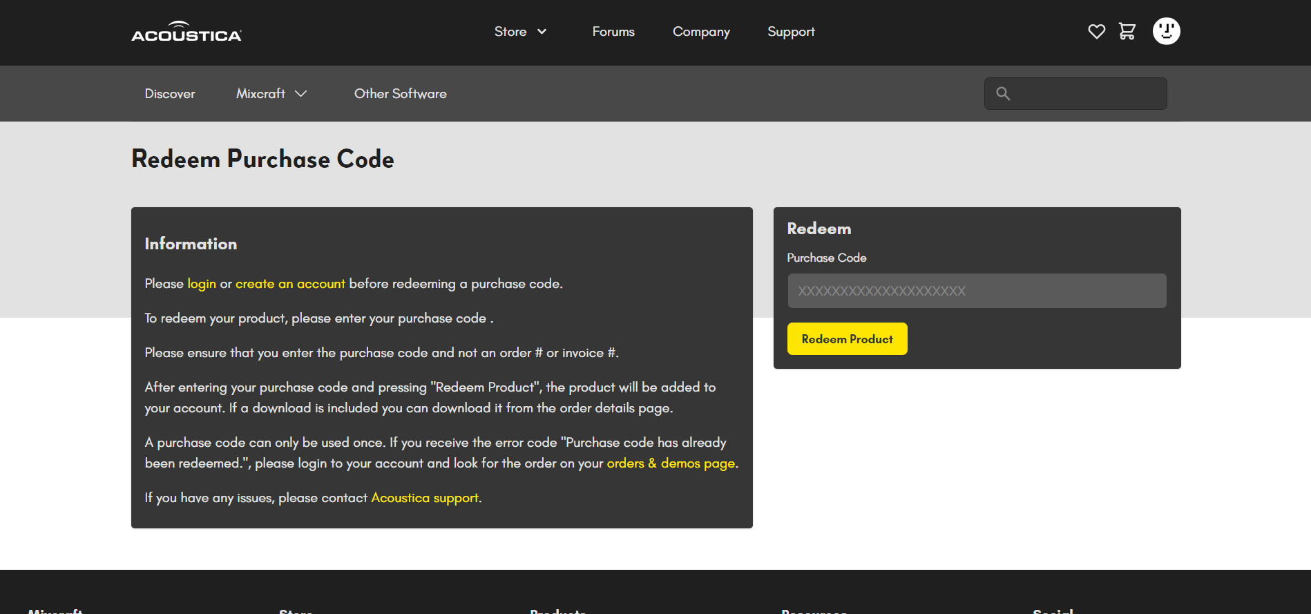 5. Once logged in, navigate back to https://store.acoustica.com/redeem > Enter the purchase code (found in the serial number section of your Plugin Boutique User Account) > Click 'Redeem Product'.
