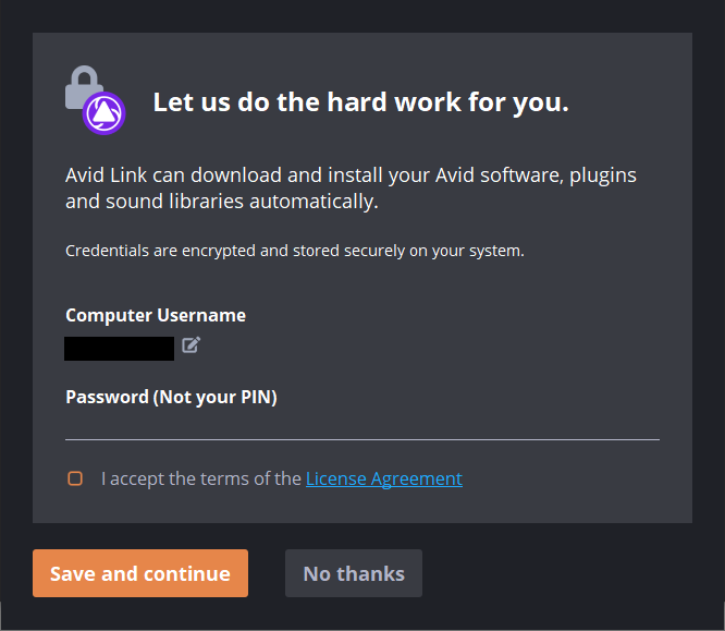 8. Enter your computer's name and password to allow Avid Link to download and install software directly > Click 'Save and continue'.