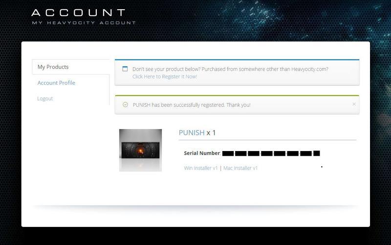 1. Thank you for purchasing PUNISH > please log into your existing Heavyocity account, or create one at - https://www.heavyocity.com/my-account/