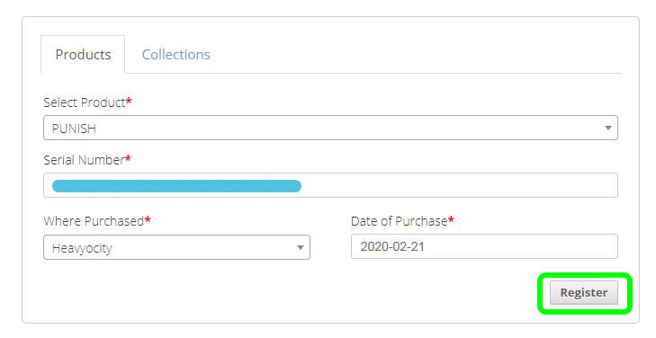 4. Select the Product 'PUNISH' from the Drop-Down list > enter your serial code along with 'Plugin Boutique' as the place of purchase and today's date > Click 'Register.'