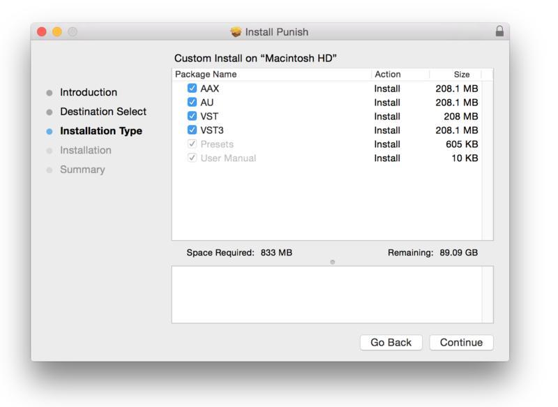 8. Select the software formats that you wish to install (in correspondence with your DAW host's accepted Plugin formats) > Click 'Continue.'