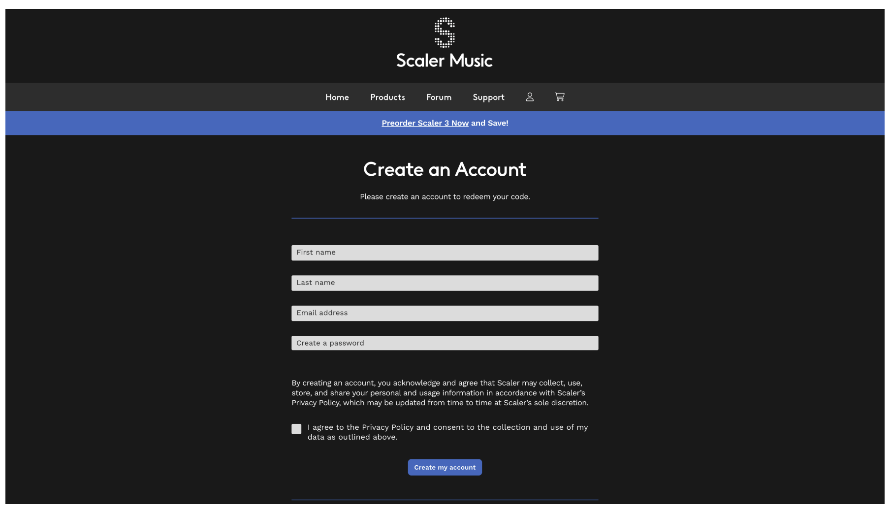 1. Create an account at https://scalermusic.com/redeem/ (This does not have to be the same email address you use at Plugin Boutique).
