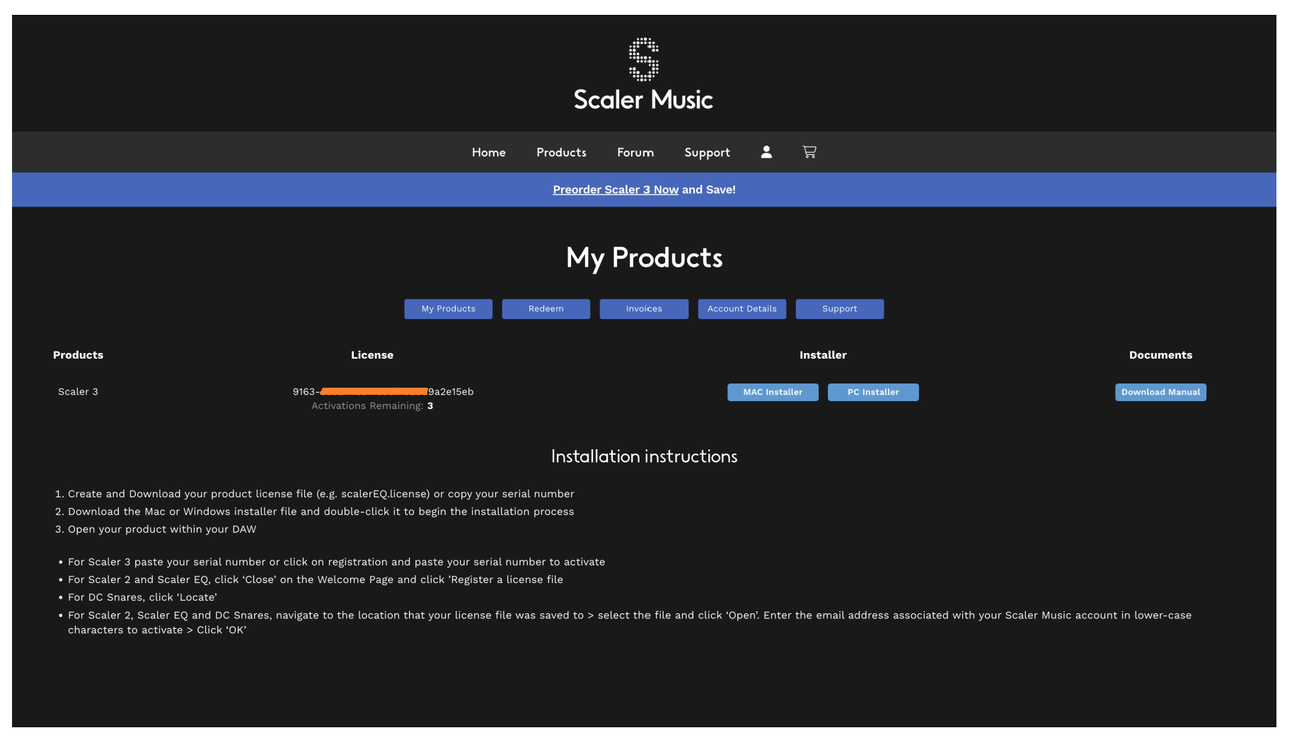 7. Click > Go to My Products or from your Dashboard click My Products where you will find your Scaler 3 Serial number, activations remaining, Mac and Windows installer and Documents downloads