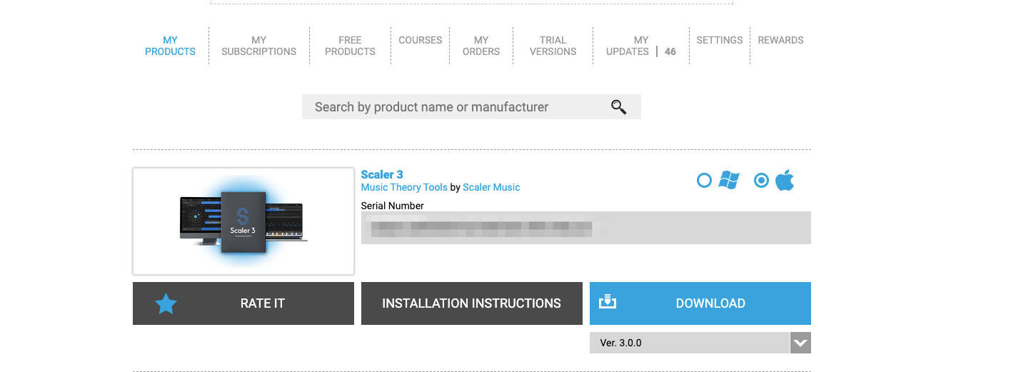 1. Find Scaler 3 in your Plugin Boutique User Account > select the download for your chosen OS (blue macOS/Windows icon) > click DOWNLOAD.