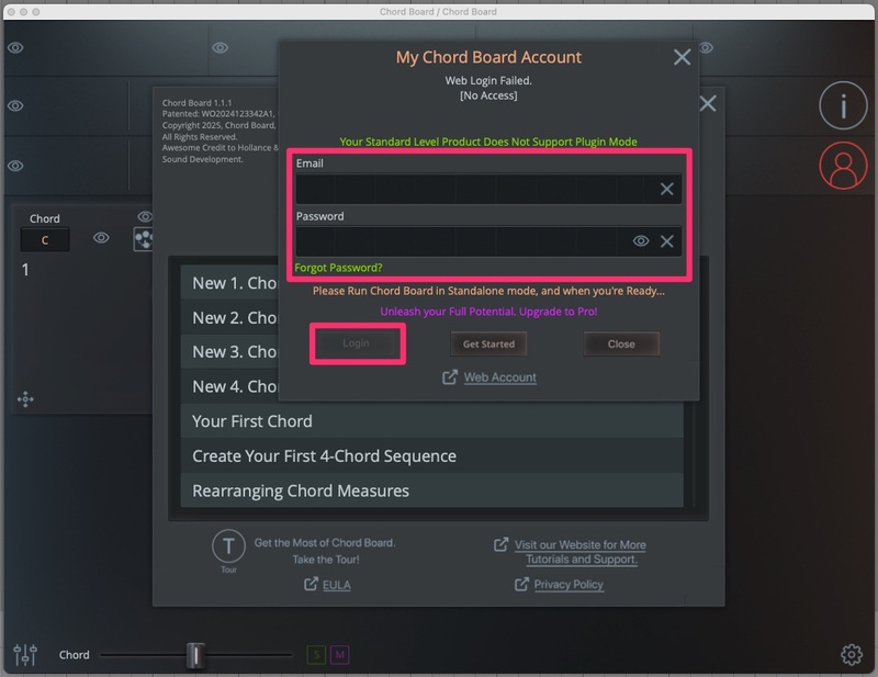5. Open Chord Board Standalone on your Windows PC, Mac, or iPad or optionally, if you have Pro, in your DAW > enter your details > click Login