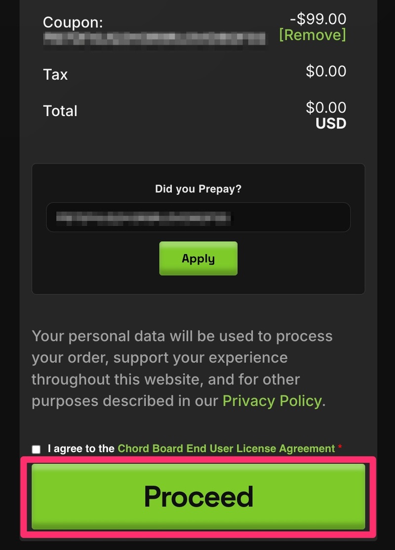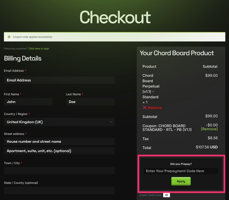 2. Enter the Prepayment Code from your Plugin Boutique Library > click Apply