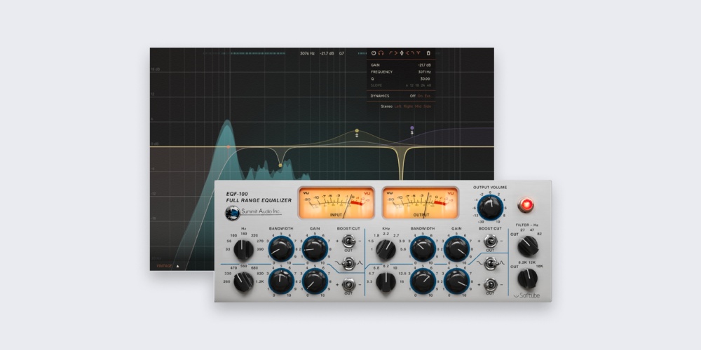 The bundle also includes the Summit Audio EQF-100, a full-range passive tube equalizer known for its smoothness and flexibility. It features four fully parametric bands, along with low and high cut filters that have three selectable cutoff frequencies each. This EQ is prized for its warm, fat sound that adds character to mixes, whether on individual tracks, subgroups, or stereo buss. Its modeled output stage distortion allows users to push the output meter into saturation, delivering a thick, woody edge.