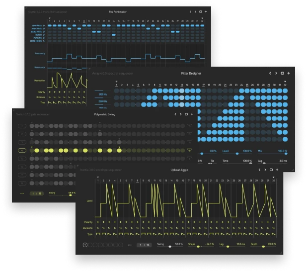 Array v4 moves into the spectral domain, splitting audio into 8 frequency bands with independent gate sequences, resonant filters, and stereo spread for detailed spectral manipulation. Cluster v3 pushes filter sequencing further, modulating every parameter with 9 filter types, multi-stage configurations, and flexible envelopes for anything from subtle movement to extreme transformations.