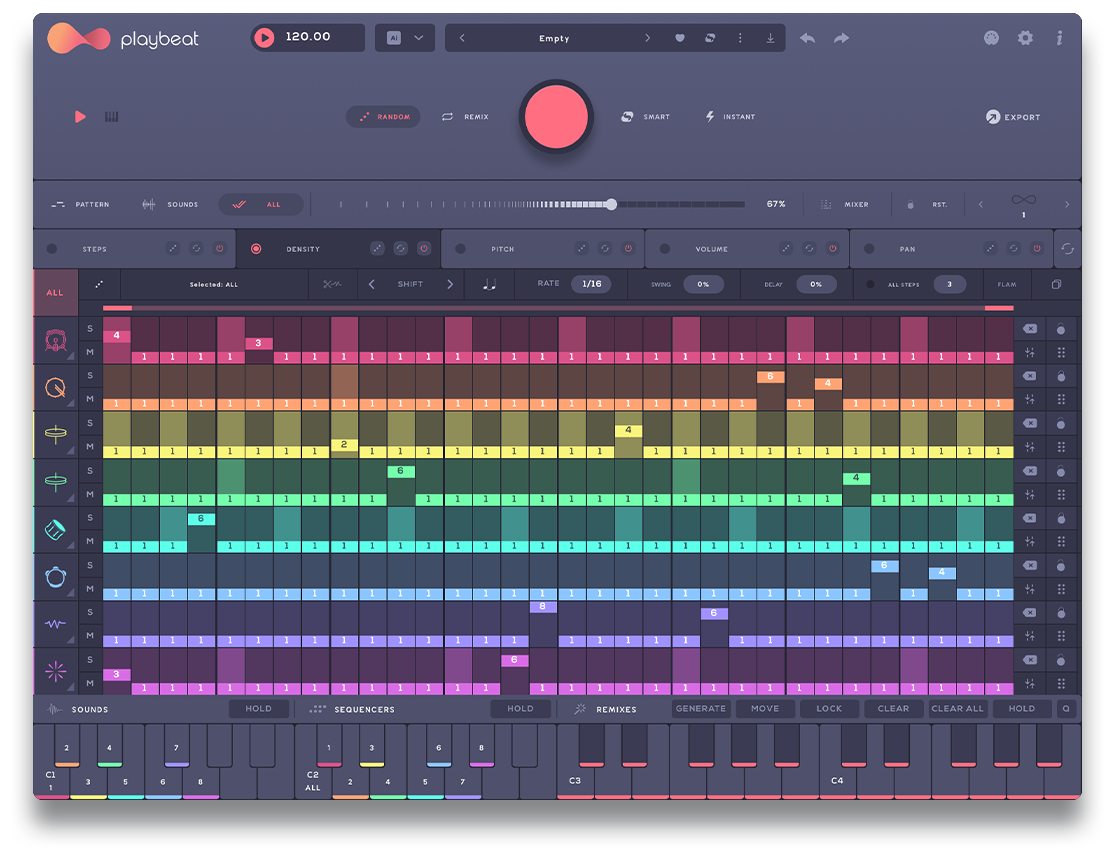 Unlike other groove creators that rely on a single algorithm, Playbeat innovates by using advanced local AI algorithms to create or remix completely original grooves that never repeat and always sound great.