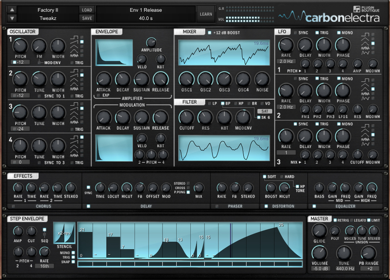 Carbon Electra's a four-oscillator subtractive synth with a modern feature set. It has been developed as an advanced learning tool whilst also being a powerful and easy-to-program synth. Being based on vintage analogue routing and featuring flexible modulation options including an editable stepper and note performer. Featuring Informative Displays, Editable Step Sequencer, Vocal Filter, Multi Unison, Integrated Distortion and Analog Control.