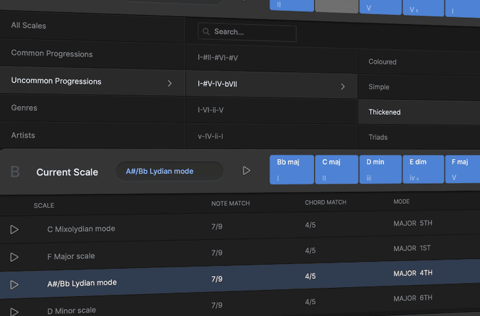 - Access over 1,000 chord sets, keys, and modes, categorized by mood, artist, and genre. Scaler 3's expanded library is now easier to navigate, offering endless possibilities, including artist sets from legends like Carl Cox, MJ Cole, and The Temper Trap, across genres from Chill and Drum & Bass to Jazz, Cinematic, Pop, and Metal.