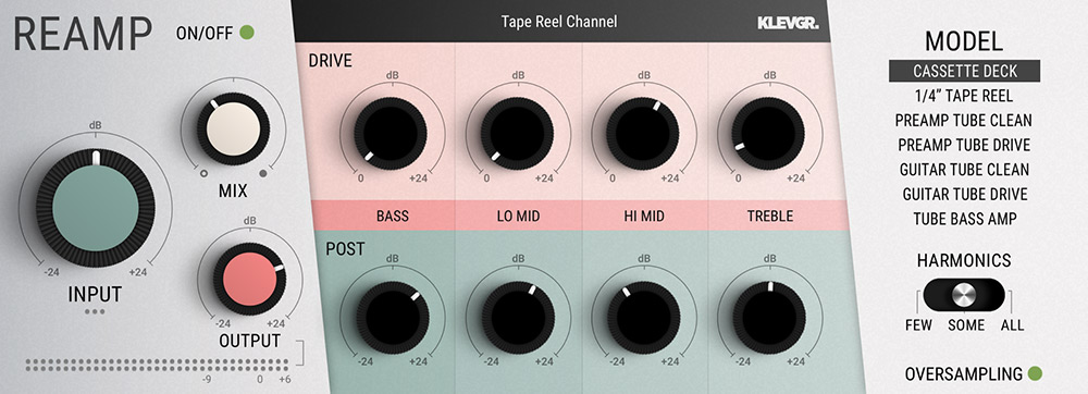 REAMP is a complex spectral saturation processor, simulating a set of different analog gear in a new and unique way. The benefits of this algorithm are that it is highly CPU efficient and adds (almost) no latency.
