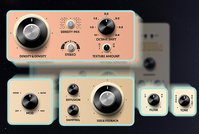 Enter the universe of textures with the dual granular engine. Shift the octave pitch of the two granular engines relative to each other to impart shimmering effects, emulate vintage string machines, or spawn an array of intricate, complex textures.