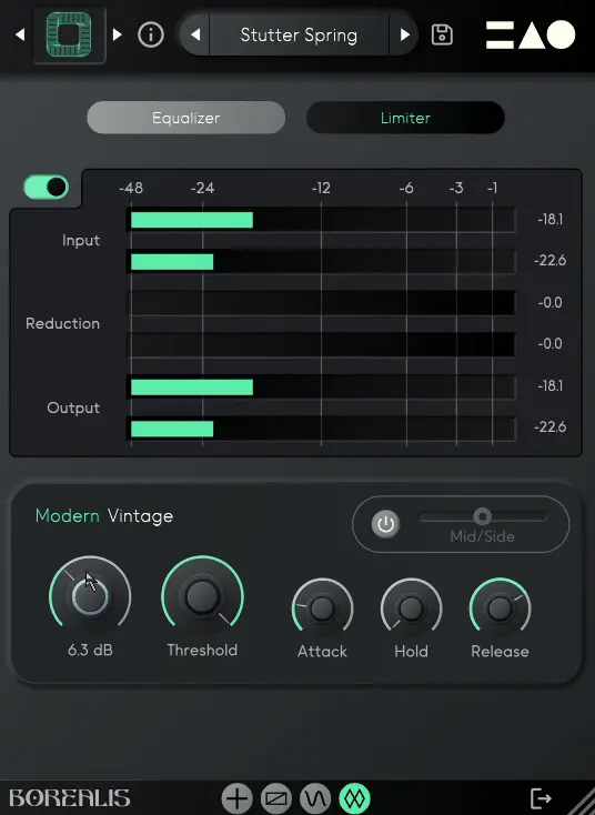 Finalize your output and glue your dry and wet with BOREALIS’ powerful mastering section including a parametric equalizer and dual-mode modern IIR look-ahead and vintage 1176-style limiters.