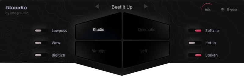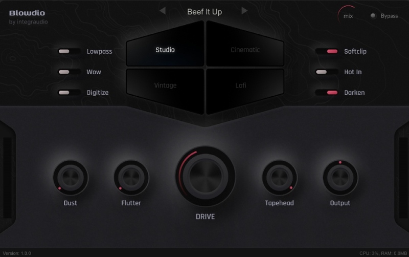 Blowdio is the latest effect plugin by Integraudio, which lets you add different colors and flavors of tape saturation to your sound. Broadly, it consists of four sections: Studio, Cinematic, Vintage, and Lofi, each offering a distinct flavor that may suit your sonics.