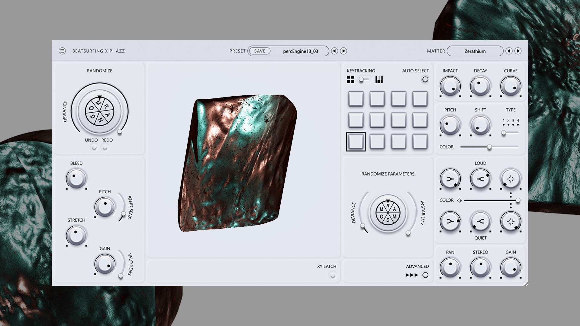 - 40+ Percussive Matter type: Choose from a wide range of sonic textures, from aggressive metallic cymbals to shakers, hi-hats or odd percussive sounds.