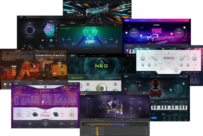 This exclusive UJAM bundle features virtual instruments and effects for guitar, bass, drums, piano, sub-bass, transitions, and multi-effects.