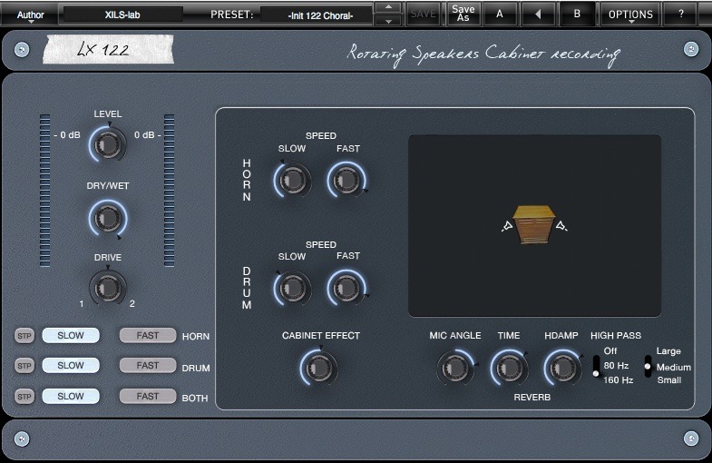 The LX122 emulates the Horn and the Drum, as well as the room where various coherent reflections are occurring when they are rotating. It also emulates the tube base amplifier as well as the intrinsic characteristics of the Drum (woofer response and drum size) or the Horn (Tweeter response, horn size and diffusers).