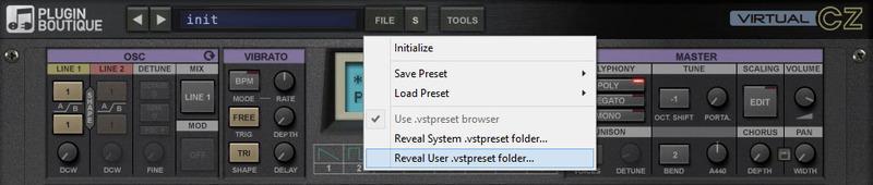 There is no fixed location, so you can place the preset files to a computer desintation of choice. Banks or individual presets can be loaded via the VirtualCZ ‘File’ option/menu, or via your VST2 host. When using the VST2 version of VirtualCZ, disable the .vstpreset browser, to load the VST2 banks.