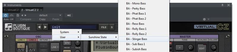 4. Close and restart VirtualCZ > select the ‘init’ tab and click ‘User’ from the drop-down menu. Select the preset name that you wish to upload and use e.g ‘BA Stinger Bass’.