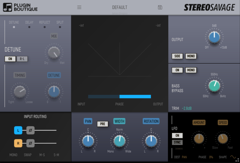 Generate stereo from mono with the 'Detune', 'Delay', 'Reflect' and 'Split' programs. Place sounds precisely in the stereo field with the 'Width', 'Pan' and 'Rotation' adjustment tools. Create movement and chorus-like effects with the 'LFO' function, and retain a solid low end with the adjustable 'Bass Bypass' tool.