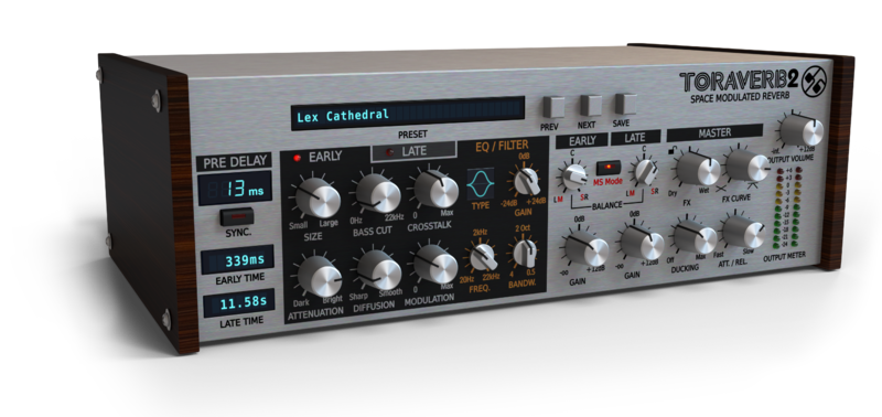 Essential functionality in most studio situations. Toraverb features a built-in ducker, which compresses the FX signal's amplitude proportionally to the loudness of dry/unprocessed input, thus saving an overall output signal energy. Such a tool built into the plug-in is a real time-saver for any music producer or studio engineer. No need to employ any additional side-chain compression unit into your fx chain and simplify this aspect of use to the minimum.