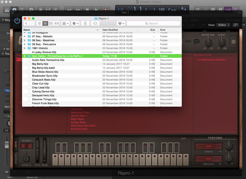 6. Your OS will show you the folder containing the factory preset library for that plug-in. You can put your new presets into this folder, or create a new sub-folder e.g 'Aiyn Zahev - Prometheus for u-He RePro-1' for them. You are free to change the folder structure in there, rename / move / delete folders and presets as you like.