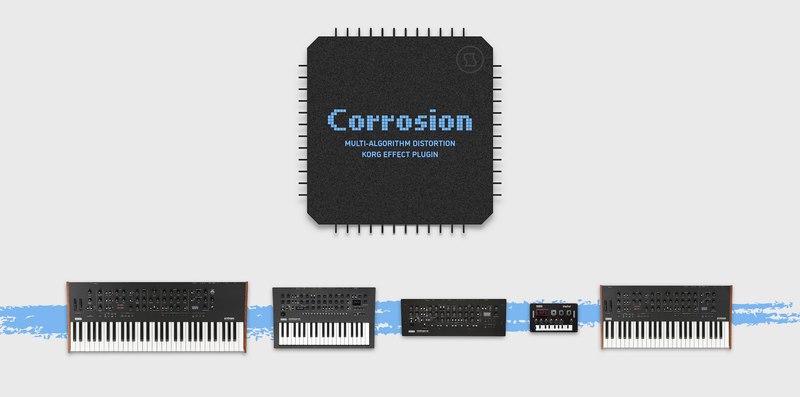 Corrosion is a multi-algorithm distortion plugin for KORG prologue, minilogue xd and NTS-1. It features a total of 10 different distortion types such as saturation, clipping, wave folding, waveshaping, and more. Each of these algorithms affects the input signal in its own unique way – dramatically enriching its spectrum and emphasizing the smallest fluctuations in its waveform. This plugin is built using 2x oversampling to reduce aliasing, for a cleaner high-frequency response. It also includes self-levelling output gain and an input gate envelope for eliminating static analog noise.