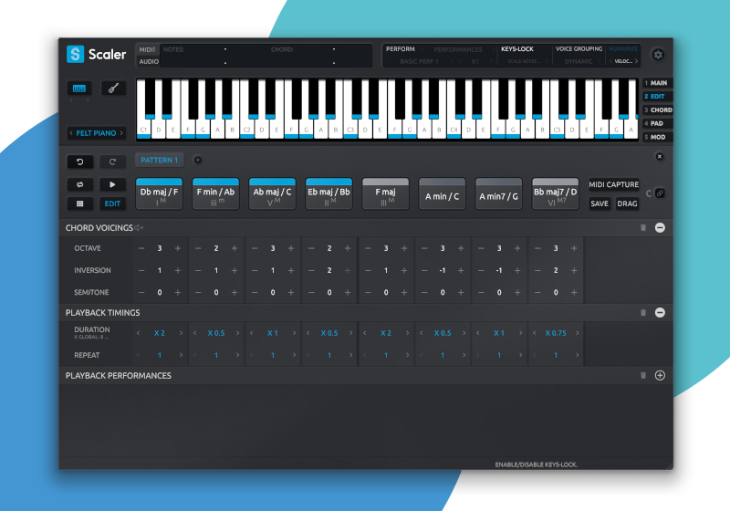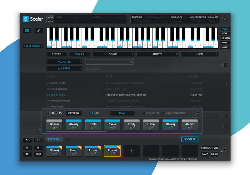 - Scaler's Bind to Keyboard feature lets you control chord playback directly from your MIDI keyboard for one-finger chords, arpeggios, and melodies that lock to your chords -making composition fast and intuitive.