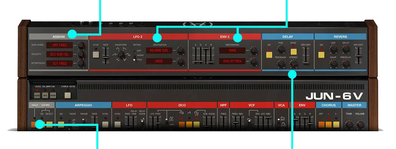 There are filters, and there are filters. Jun-6 V perfectly emulates the simple yet refined sculpting capabilities of its ‘80s ancestor. Go for bubbling low-pass warmth, dynamic high-pass tension, or a combination of the two.