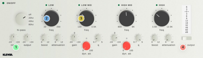 3. Dynamic parametric EQs - These work a bit differently than the Low & High filters – a dynamic processor attenuates the signal. Fine-tune with the gain knob.