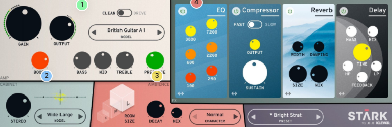 What separates Stark from other amp simulators is that the Cab, Amp and Ambience modules are built on Klevgrand’s very own algorithms that doesn’t involve any convolution or FFT analysis. This approach renders a more natural response to dynamics over the whole frequency spectrum, plus the ability to fine-tune each profile in ways that just isn’t possible when using convolving methods.